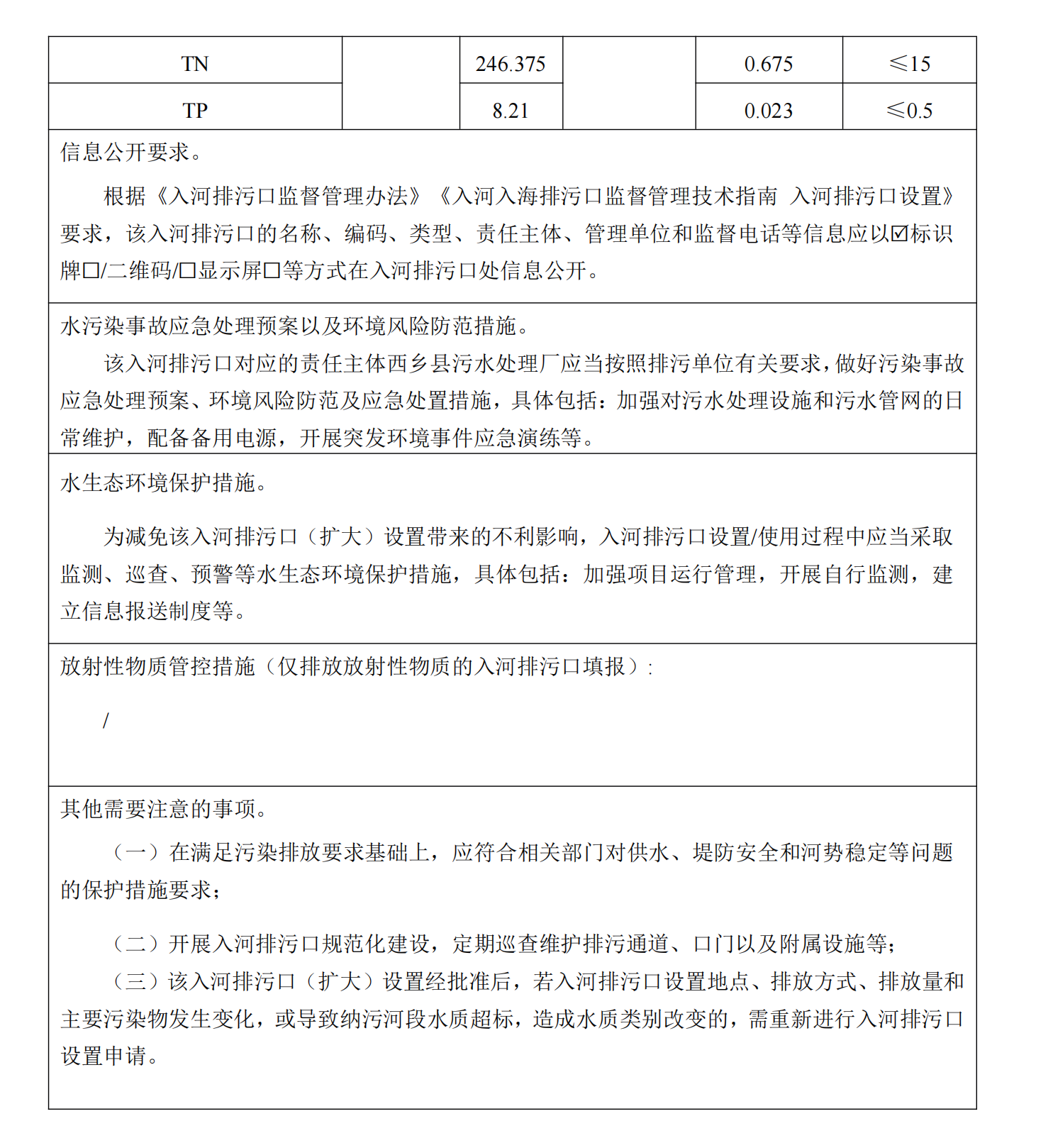你单位于2025年11月11日向我局提出了西乡县污水处理厂二期建设项目入河排污口(扩大)设置申请。经审查,根据《中华人民共和国行政许可法》第三十四条、《入河排污口监督管理办法》(生态环境部令第35号)的规定,同意西乡县污水处理厂二期建设项目入河排污口(扩大)设置决定如下: