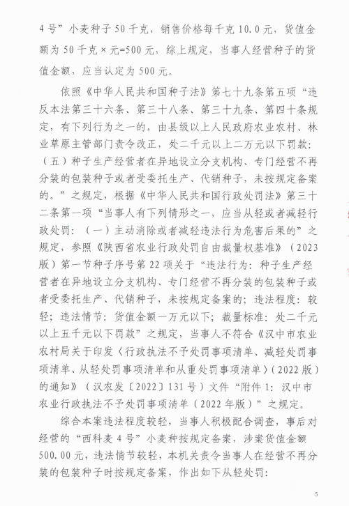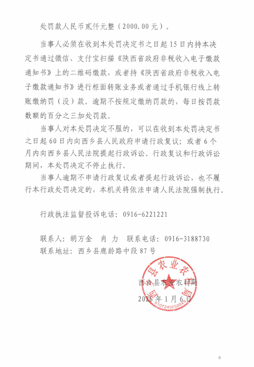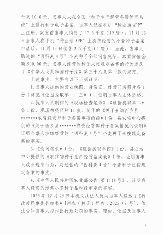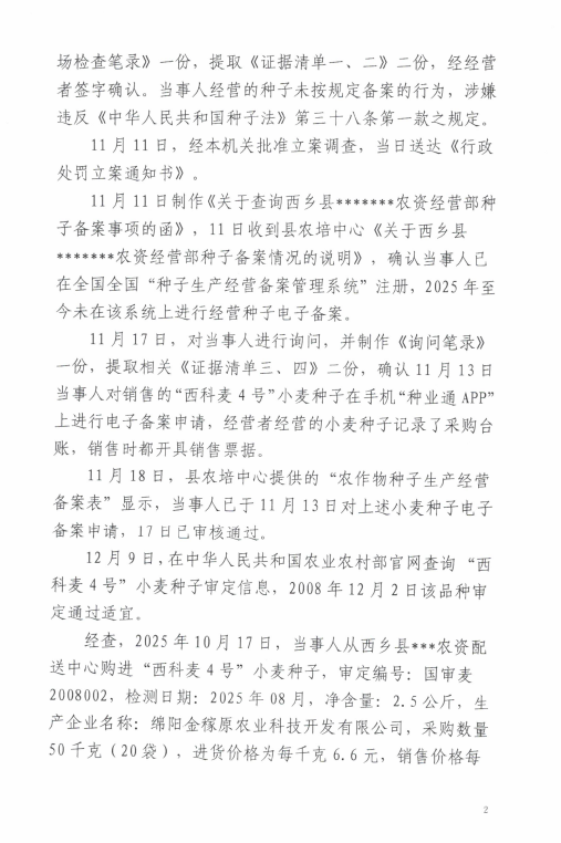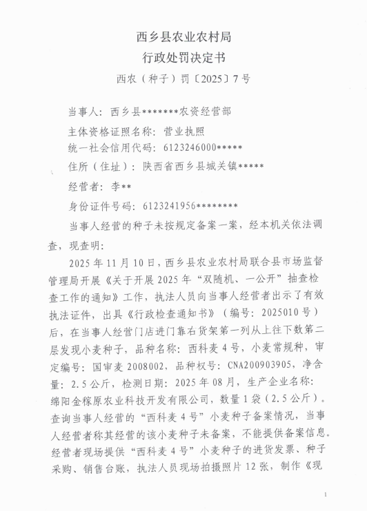西农(种子)罚﹝2025﹞7号 西乡县农业农村局行政处罚决定书
