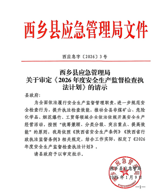 为深入贯彻《中华人民共和国安全生产法》等相关法律规定,严格落实《国务院办公厅关于严格规范涉企行政检查的意见》等工作要求,切实履行安全生产监管职责,规范行政执法行为,提升监管执法效能,西乡县应急管理局结合县情实际,特制定2026年度安全生产监督检查执法计划。