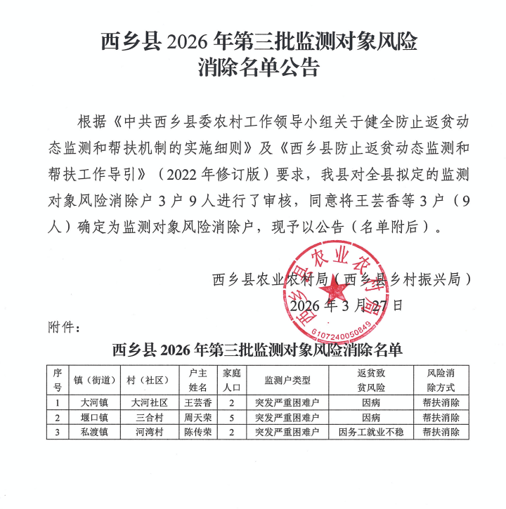 西乡县2026年第三批监测对象风险消除名单公告