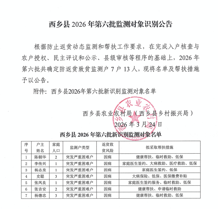 西乡县2026年第六批监测对象识别公告